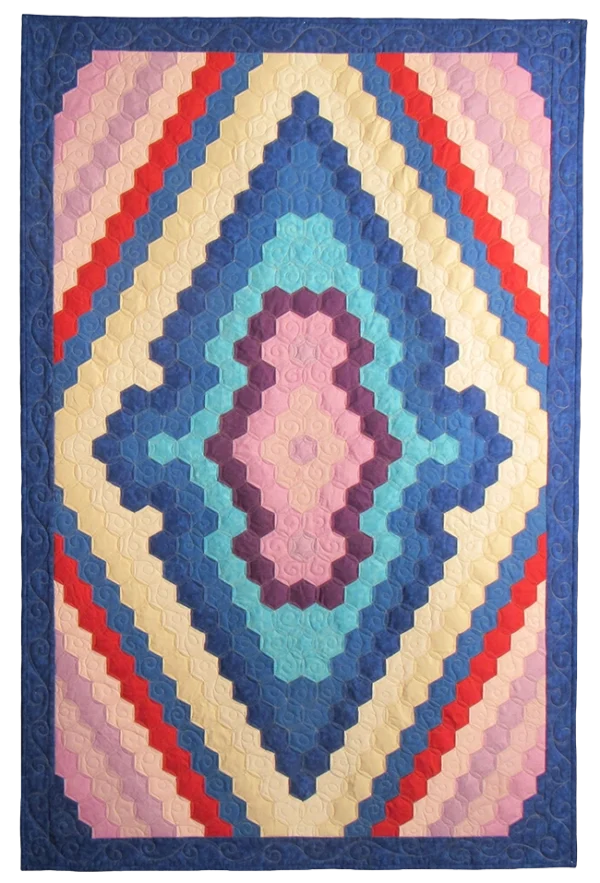 The repeating hexagon rows build naturally into the bargello-style shapes, letting the colors do the heavy lifting while you enjoy approachable, step-by-step piecing. A bold border frames the entire quilt, giving it a striking finish that looks impressive on any bed, wall, or display rack.