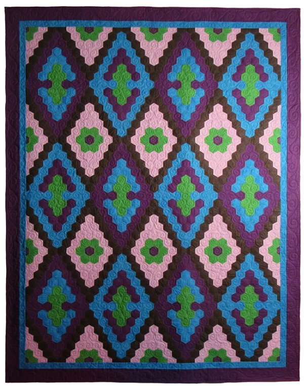 The repeating diamonds build naturally from row to row, creating a woven, almost optical-illusion effect that brings incredible depth and movement to the finished piece. A coordinated border frames the design, letting the colors and shapes shine.