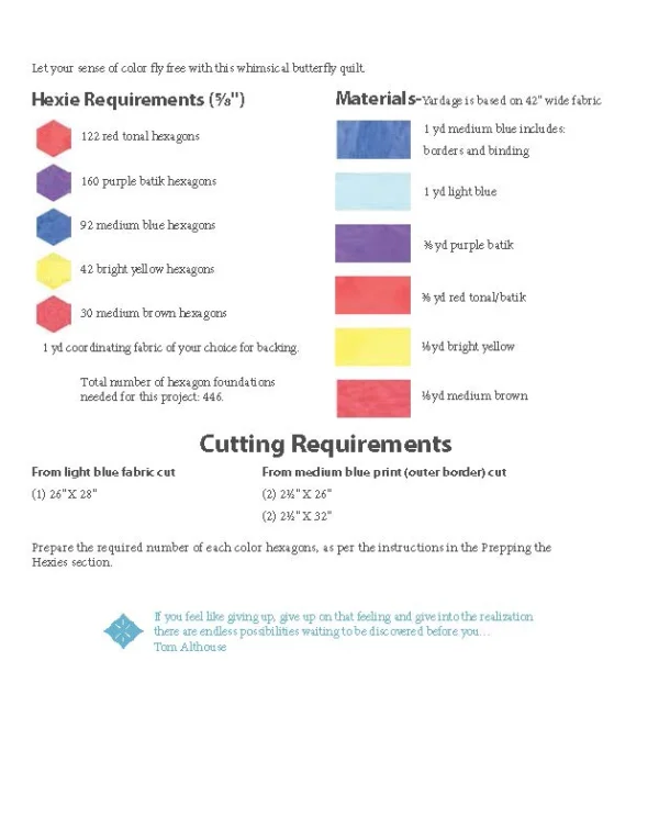 Whether stitched slowly or pieced swiftly, Flutterby Butterfly is a joyful project that proves quilting really can help your spirits soar one hexagon at a time.